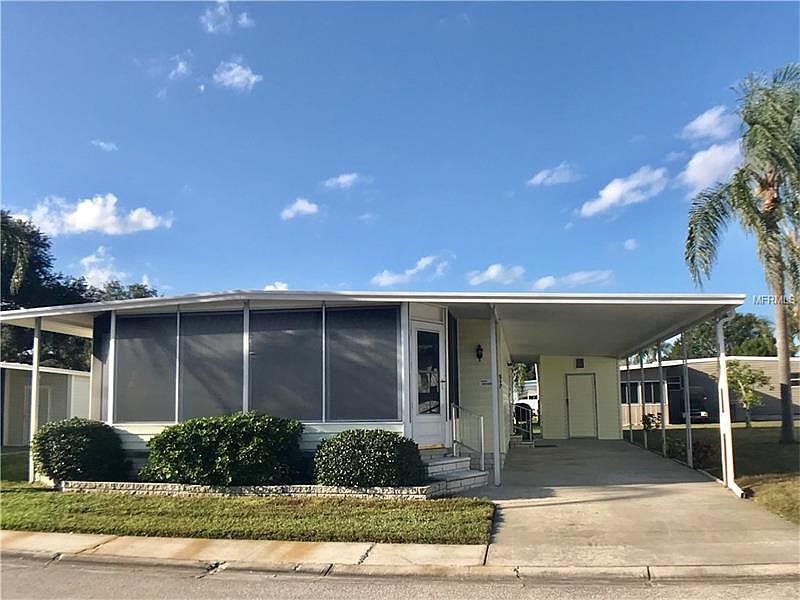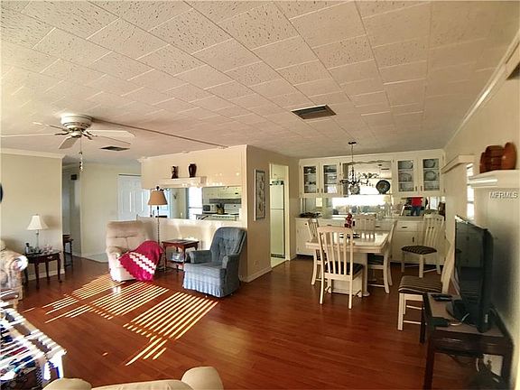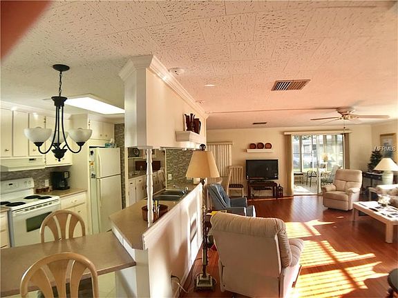 LARGE OPEN FLOOR PLAN WITH A SCREEN ENCLOSED FLORIDA ROOM ON THE FRONT WITH SLIDING VINYL TENTED WINDOWS. ROOF OVER AND VINYL SIDING ON THE OUTSIDE OF THE HOME. CERAMIC TILE FLOOR IN THE SCREEN ROOM, KITCHEN AND BATHROOMS. THE BEDROOMS HAVE CARPET AND THE REST OF THE HOUSE HAS BEAUTIFUL LAMINATED WOOD FLOORS. THE PAINTED WALLS AND CROWN MOLDING ARE VERY TASTEFULLY DONE. FULLY FURNISHED AND READY FOR A NEW OWNER. 2017 NEW A/C WITH DUCT WORK IN THE CEILINGS. THIS HOME IS ONE OF THE LARGEST FLOOR PLANS. THE 55+ COMMUNITY SPEAKS FOR ITSELF. PLAY ON THE 9 HOLE PAR 3 GOLF COURSE IN THE MIDDLE OF THE COMMUNITY FOR A SMALL YEARLY FEE OF $305. 2 POOLS AND JACUZZI'S AND A LARGE CLUBHOUSE WITH MANY ACTIVITIES TO CHOOSE FROM.