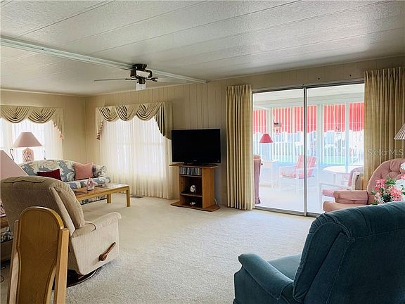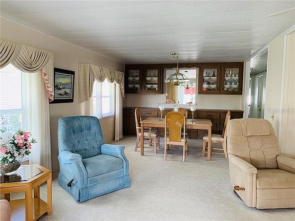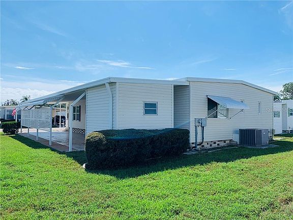 THIS HOME IS LIGHT, BRIGHT AND IMMACULATE FOR ITS AGE AND SIZE. FRONT FLORIDA ROOM FACES SOUTH AND WAS COMPLETELY ENCLOSED WITH WINDOWS IN 2000 ALONG WITH THE REST OF THE WINDOWS. NEWER A/C IN 2010. FULLY FURNISHED AND READY FOR A NEW OWNER. NOT IN THE PET SECTION OF THE COMMUNITY. ALL NEW APPLIANCES INCLUDING WASHER AND DRYER IN THE SHED. KITCHEN HAS EAT IN BREAKFAST BAR AND 3 LARGE CLOSET PANTRIES. BOTH BEDROOMS ARE LARGE IN SIZE AND HAVE EXTRA LARGE WALK IN CLOSETS. BUILT IN HUTCH IN DINING ROOM AND ALL THE LIGHT COLOR CARPET IS IN GREAT SHAPE. LAMINATE FLOORS IN THE KITCHEN AND VINYL FLOORING IN BOTH BATHROOMS. LARGE WALK IN SHOWER IN MASTER BATHROOM. THIS HOME AND COMMUNITY IS TRULY A MUST SEE AND WILL IMPRESS YOU FROM THE TIME YOU ENTER THE COMMUNITY AND WALK THROUGH THIS BRIGHT HOME AND BEYOND. HOMES OF THIS SIZE AND CONDITION DO NOT LAST SO HURRY BEFORE ITS TO LATE. THIS IS A 55+ RESIDENT OWNED COMMUNITY WITH 751 HOMES AND ALL HAVE EQUAL SHARE VALUE. THE SHARE VALUE IS $55,000 AND IS INCLUDED IN THE LIST PRICE OF THE HOME. THIS RETIREMENT LIFESTYLE WILL WOW YOU AND THERE IS SO MANY ACTIVITIES TO CHOOSE FROM. THE 9 HOLE PAR 3 GOLF COURSE IS ONE OF A KIND AND WELL MAINTAINED BY THE ASSOCIATION. THE SMALL YEARLY FEE TO JOIN THE GOLF MEMBERSHIP IS $326.00 AND PLAY AS MUCH AS YOU LIKE. 8 FULLY COVERED SHUFFLEBOARD COURTS AND 2 POOLS & JACUZZI'S. HURRY COME LOOK BEFORE IT SELLS!