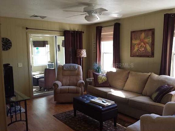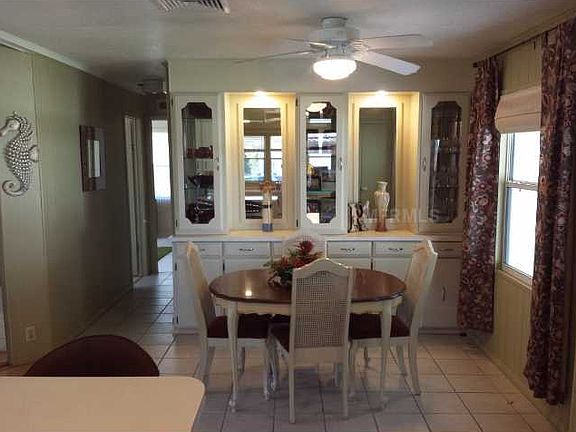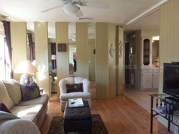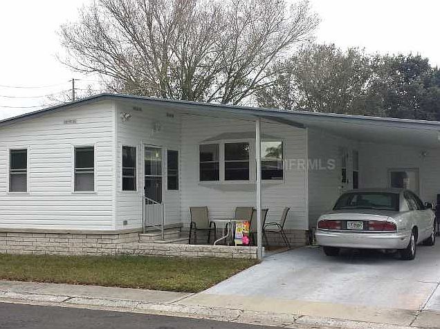 THIS HOME IS NEATLY TUCKED AWAY AND IN A PRIVATE LOCAION IN THE BACK OF THE COMMUNITY. HIGH CEILINGS AND THE A/C DUCTS IN THE CEILING. LAMINATED WOOD FLOORS IN SOME AREAS. OPEN KITCHEN WITH A BREAKFAST BAR. DINING AREA HAS A BUILT IN CHINA CABINET. ENCLOSED FRONT FLORIDA ROOM AND SOME NEWER WINDOWS. LARGE WORKSHOP SHED FOR ALL THE TOOLS AND BIKES. ROOF OVER AND VINYL SIDING MAKE THIS HOME VERY NICE ON THE OUTSIDE. MOSTLY FURNISHED AND READY FOR A NEW OWNER. THE 55+ COMMUNITY IS ONE OF A KIND AND WILL IMPRESS YOU AS SOON AS YOU PULL IN PAST THE GUARD GATE THAT IS MANNED FROM 6PM TO 5AM. 2 POOLS AND JACUZZI'S ALONG WITH A PAR 3 GOLF COURSE IN THE MIDDLE. THIS IS TRUELY A GREAT RETIREMENT LIFESTYLE! COME TAKE A LOOK AT ALL THE COMMNITY HAS TO OFFER.