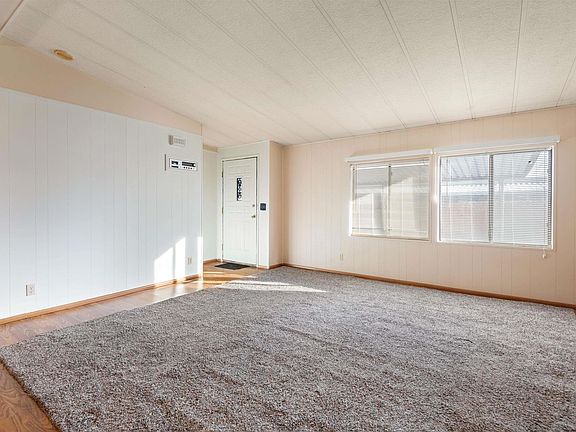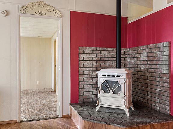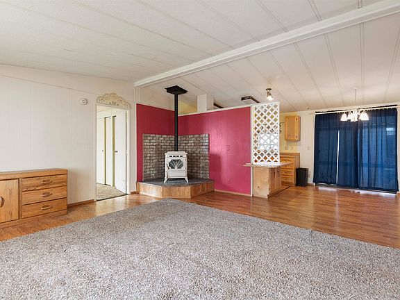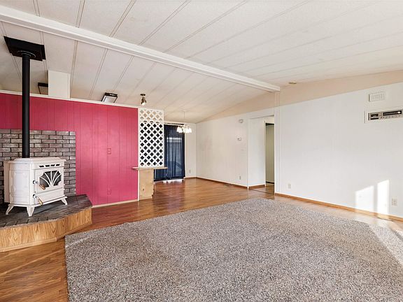 MLS# 266066 55+ Community living! Are you looking to downsize into a retirement community but don't want to break the bank? This three-bedroom, two-bath, manufactured home has the potential to be completely renovated and upgraded to meet all your needs and become the perfect retirement home.You'll enter through the front door into a charming living room with a raised wood fireplace and brick detailing. The open-concept living space has plenty of room for large furniture and has a dining area just off the kitchen. The roomy galley kitchen comes with an eat-in bar for casual meals or extended food prep. A range hood offers added convenience and the knotty pine cabinets provide ample storage for all your kitchen needs. The kitchen also provides access to a laundry room and pantry combo.Off the primary living space are two carpeted spare rooms that could be used as bedrooms or craft spaces. The shared bathroom is located just off the hallway with an enclosed shower, vinyl tile, and a large double cabinet sink space. The adjoining hallway has plenty of space for floating and cabinet storage. The primary bedroom has plenty of space for furniture and is complete with an en suite bathroom with a double sink, alcove style shower, and bathtub, and vinyl tile flooring. Outside you'll find an awning covered parking pad that doubles as a breezeway to the backyard. The property has mature trees and low-maintenance landscaping with enough space for green thumbs to set up shop and garden. The outdoor living space is completed with a freestanding sheltered patio gazebo, perfect for entertaining or enjoying your backyard. Plus, there's an insulated shed with electricity that is great for storage or could even be used as a work or hobby area.