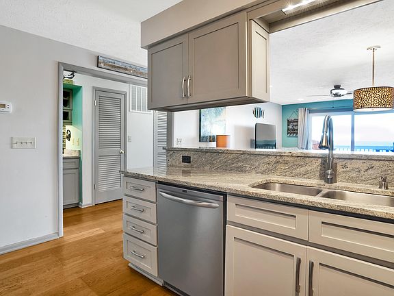 Beautiful top floor, 3 bedroom 2 bath ocean front condo in Ocean Dunes, equipped with building elevator, comes fully furnished, most personal contents and a rental annual income from prior year over $40K! Gorgeous ocean views from your open living space and master bedroom. The condo has many upgrades including granite counters in the kitchen, stainless appliances, laminate flooring, tile back splash in kitchen and wet bar, tastefully decorated for a turn key investment, primary or vacation home for you and your family. A convenient covered, caport storage closet for your beach gear. The HVAC was replaced in 2018, hot water tank in 2017. Full building maintanence was completed in 2017. Ocean Dunes has some of the islands best amenities with 3 outdoor pools, an indoor pool, fitness room, clubhouse and more! With incredible sunrises to experience and sand between your toes, your new beach getaway will impress in every way.