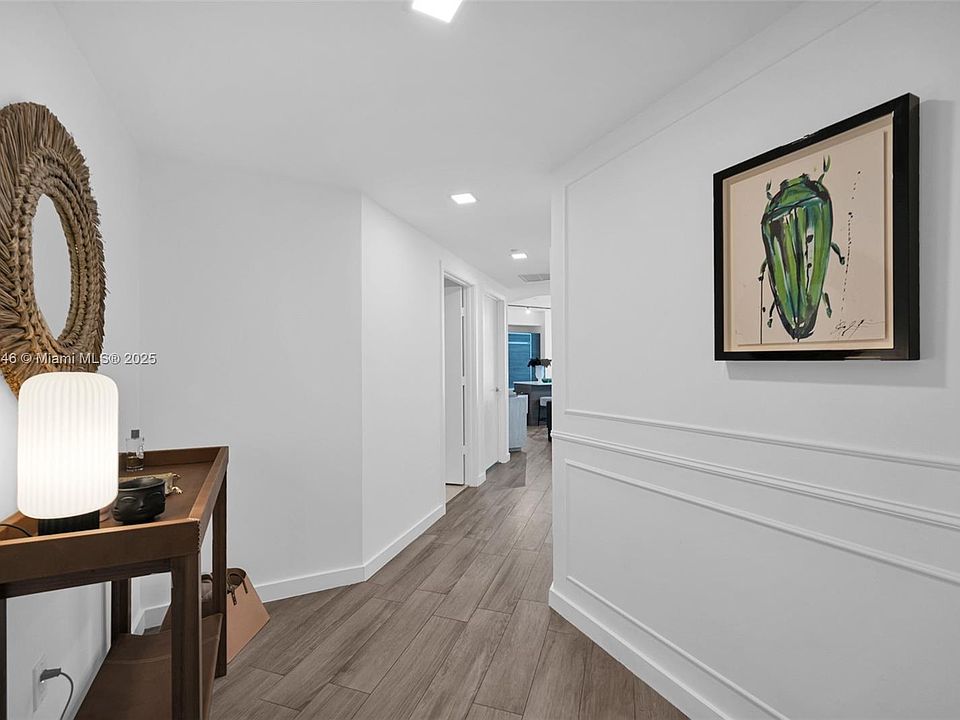 Chic gray wood tilesIn-unit washer and dryerPremium shadesCustom closetsSleek stone counters