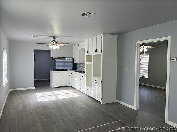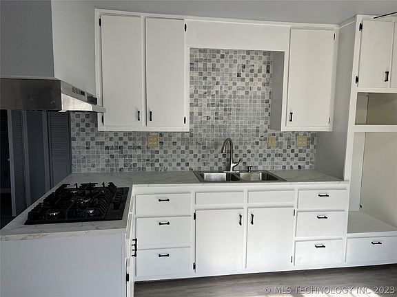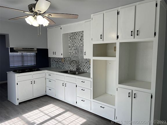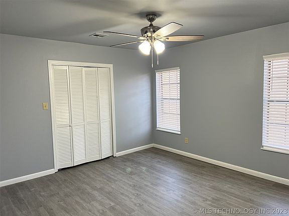 Updated home on corner lot close to Okmulgee Municipal Park. New roof, paint, flooring, & appliances. Oversized bedroom and bathroom with jetted tub and separate shower. Covered front porch & fully fenced yard. Detached garage has electric, work area and carport.