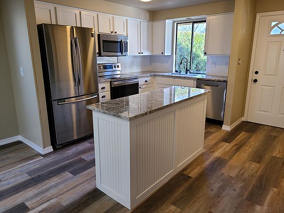 Renovated Single Level Within Last 2 Years (End Unit) 2 bedroom 2 full baths Approx 1000 Sqft! Condo. All new water proof vinyl flooring throughout, New granite counter tops, Samsung kitchen appliances, Includes Newer Washer & Dryer less than 1 year old, large under mount farm sink, center island with lots of storage, pantry, high efficiency AC/Heat Pump, Freshly painted inside, New bathroom vanities with granite counter tops, New plumbing fixtures throughout, New ceiling fans and led can lights throughout, inside laundry, this unit is light and bright! Brand New Stamped Concrete back patio with cover, Carport for 2 vehicles, Storage locker, Immaculate common area grounds.
