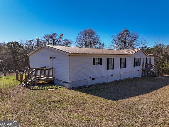 Located in Dry Branch, Georgia, this 106-acre property offers a blend of comfortable living, functional improvements, and versatile land. Set behind a gated entrance along Sapp Road, the winding driveway provides a quiet approach to the home and creates a private setting for both residential and recreational use. The 2,108-square-foot mobile home has been recently updated and comes with all appliances shown. The layout includes a spacious living room that opens directly onto a covered wood porch overlooking the fenced backyard-an ideal setup for enjoying the outdoors or keeping pets secure. The master suite is generously sized and includes a double vanity, walk-in shower, and private bathroom. Two additional bedrooms sit across the main living space and share their own full bathroom. A half bath is located near the entryway laundry area for convenience. The kitchen features a roomy pantry, bar-top island for easy serving, and an adjacent dining area. Near the home sits a metal shop building set on a concrete slab, complete with an additional exterior pad off the two roll-up doors. A tall overhang along the side of the structure provides useful space for storing equipment or implements, and additional covered area behind the building increases its utility. A separate skinning shed is located nearby, adding a practical feature for hunters or land managers. An additional well and septic tank are located on the property as well. The land itself offers a balanced mix of open and wooded acreage. Approximately 11 acres of fallow fields sit near the home and could be restored as pastures, converted to wildlife habitat, or used for planting. The remainder of the acreage consists of mixed timber in various age classes common to this region of Georgia, offering both natural beauty and long-term management opportunities. A trail system extends throughout the property, making it easy to access the interior acreage, reach hunting areas, or work the land. With its combination of renovated living space, substantial outbuildings, private setting, and diverse land characteristics, this property provides a strong foundation for multiple uses-full-time residence, recreational retreat, or timber and habitat management.