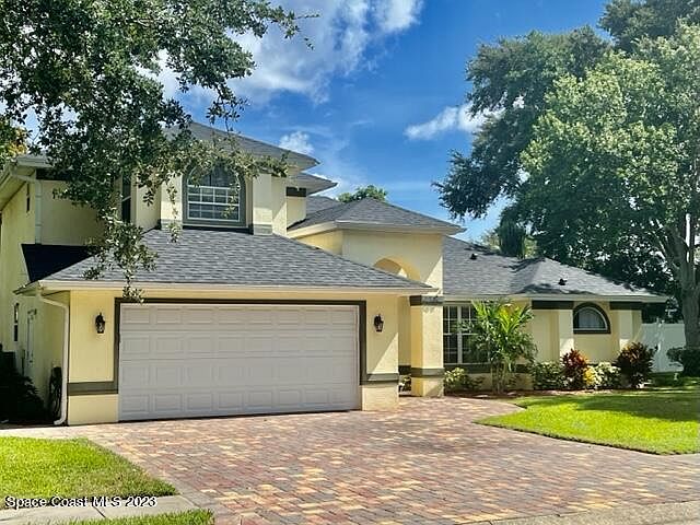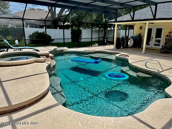 Welcome Home! Come see this beautiful 4 bedroom 2.5 bath home located in South Merritt Island. This home has a large open floor plan, with high ceilings and a separate dining room and eat-in kitchen and tile flooring. The primary bedroom located downstairs has 2 walk-in closets, and a remodeled bathroom with relaxing soaking tub, walk-in-shower, rain shower head, double sinks and quartz counters. 3 additional bedrooms are located upstairs. Spend your days in your resort style screened pool and hot tub area over-looking your private backyard with a tropical mango tree. The home also includes a spacious laundry room, 2 car garage w/ a brick pavered driveway. Roof 2019, Septic tank and drain field 2020, AC 2022, Water Heater 2022. HOA only $350 annually.
