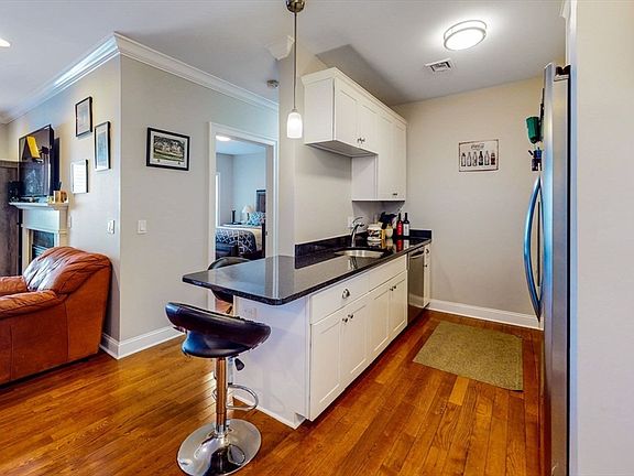 Step into a world of endless possibilities in this beautifully designed 806 sq. ft. apartment. The heart of this home is the stunning open-concept kitchen & living area, where gleaming hardwood floors & crown molding create an air of sophistication. The modern kitchen boasts sleek white cabinetry, contrasting dark countertops, & convenient breakfast bar - perfect for casual dining or entertaining friends. The spacious living room is bathed in natural light, thanks to large windows & sliding glass doors that lead to your private balcony. Here, you can sip your morning coffee while enjoying serene views. Back inside, the generously sized bedroom offers a peaceful retreat, complete w/ample closet space & windows that frame picturesque outdoor vistas. The bathroom features a granite-topped vanity, glass shelving, and a combination shower/tub. Enjoy easy commuting to Highways and VA Hospital, nearby walking trails at Millennial Park, Legacy Place shopping & eateries and more!