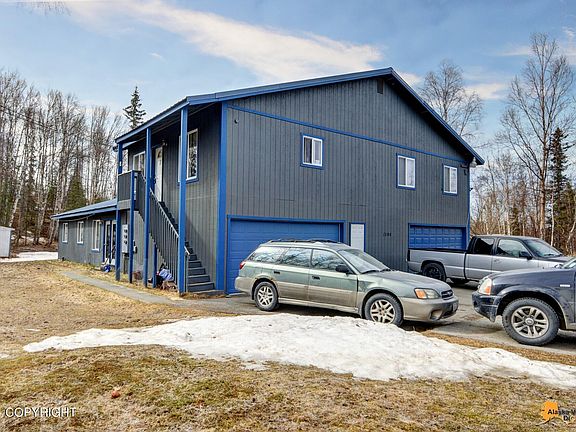 Wasilla Triplex with Two 2-Car Garages! New Septic! Fully Rented with Long Term Tenants, Never An Issue Renting Vacancies. Each unit has 2 Bedrooms, 2 Baths w/ Washer Dryer in Each Unit. 2 Storage Sheds. Newer Laminate Flooring and 75 Gal Water Heater. Large Lot approx 1 Acre. Located on Quiet Cul-De-Sac. Gross Rents total $49,200 per year. See Supp for breakdown.Unit 1, Month to Month @ $1500 Unit 2, Month to Month @ $1375 + E Unit 3, Lease through May @ $1225 + E Owner pays heat and electric for #1 as that meter includes well and common areas.