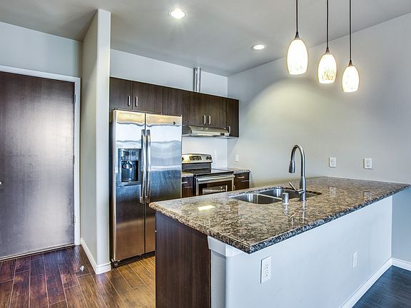 Enjoy a sophisticated urban style condo that is convenient to H-Mart and the shops, restaurants and businesses that surround it. This gated four story building offers elevators, a secure entry to the building and units, fitness and yoga rooms, a lounge area, and a business center. The beautiful interior courtyard boasts an incredible pool, sitting areas and lovely gardens. The condo has an intimate floor plan featuring granite countertops and stainless-steel appliances in the kitchen, wood flooring, a luxurious bath, and ample storage. The refrigerator and stackable washer/dryer are included in the unit and the HOA provides water, trash and building insurance. This wonderful commuter location offers easy access to George Bush Turnpike, Sam Rayburn and North Dallas Tollways, I-35, and the DART Rail Station. This is one you won't want to miss!