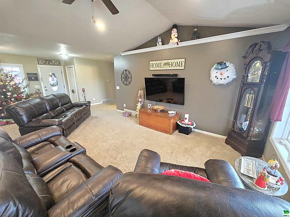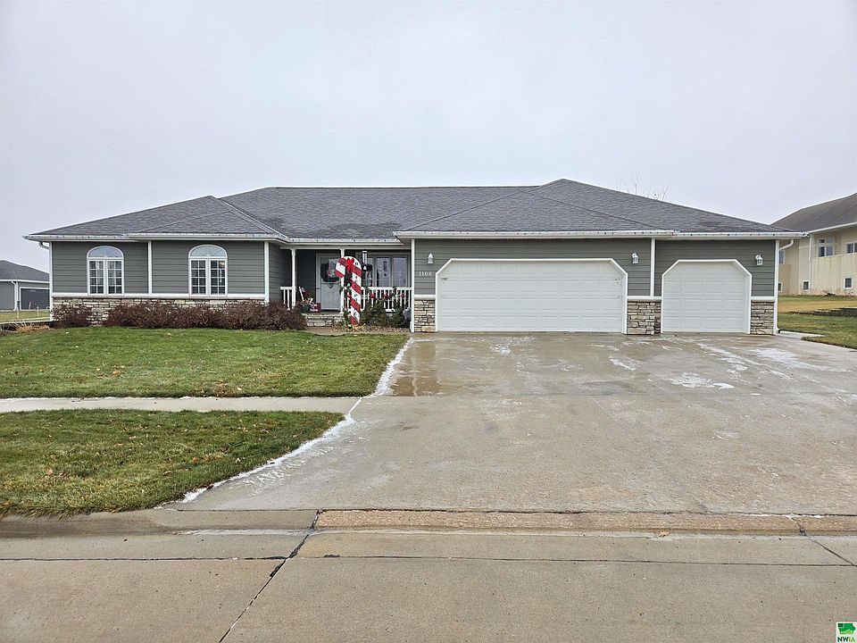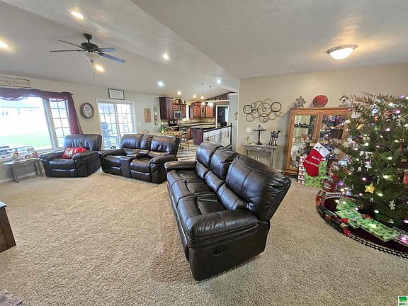 1100 Westerner Drive is situated on a flat, corner lot in Akron with easy access to highway 3 and just blocks from the Akron Golf Course. Step inside to the open concept floor plan with a vaulted ceiling spanning the length of the living room and kitchen. The beautiful kitchen boasts stained cabinetry, a large island with pull out drawers and end outlets, granite counter tops, luxury vinyl plank flooring-new in 2019, and access to the covered deck for easy entertaining. There are three bedrooms on the main floor along with a fourth in the basement. The large master bedroom offers a walk-in closet along with a full attached bathroom-jacuzzi tub, tile floor and double vanity. In addition to the fourth bedroom, the finished basement offers a bar area with ample seating space, a spacious living room and an additional room to use for a pool table, workout space, could be finished as an additional bedroom, or anything to fit your needs! Additional highlights of this property include-oversized three stall garage with electric heater and hot/cold water spickets, siding and roof were redone in 2019, furnace and AC units were both replaced in 2021, sprinkler system, main floor laundry, separate office, and radon mitigation has been installed. This turn-key property is ready for you! Selling As-Is (can do inspections for buyers' knowledge).