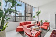 Contemporary kitchenSpacious bathSleek white cabinetryHeated infinity poolOpen-concept designDramatic floor-to-ceiling skyline viewsSoaring ceilings