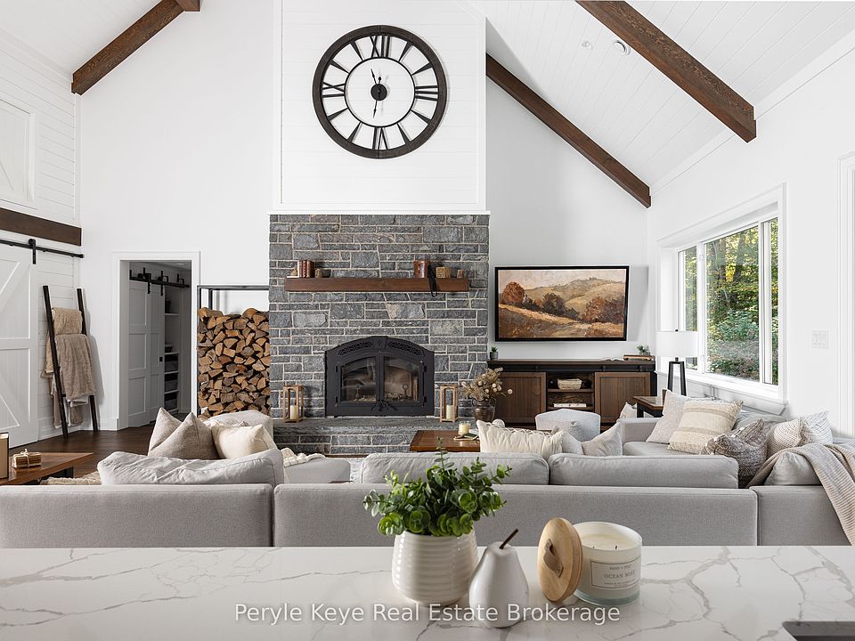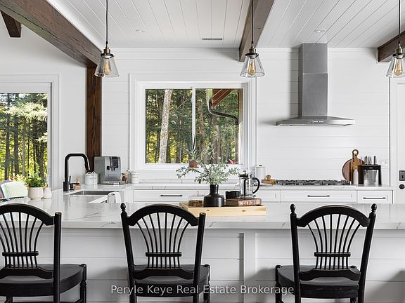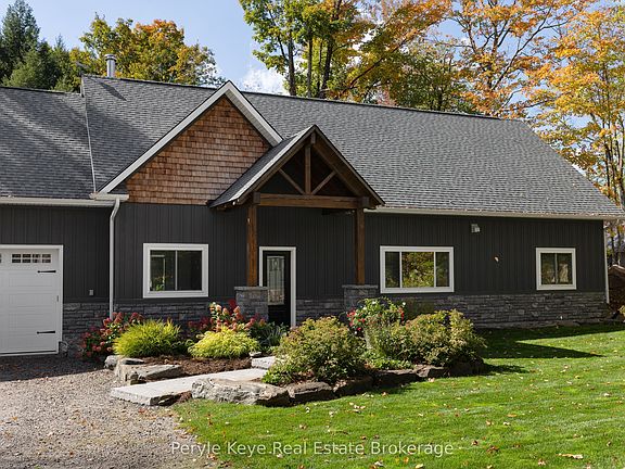 Every story starts with a setting. This one is set where craftsmanship, comfort, and quiet Muskoka living converge on a beautifully landscaped acre of land. Tucked into an upscale community just south of Gravenhurst and 1.5 km to HWY 11, this custom built 2022 bungaloft offers around 2600 sq ft of refined living space with a floor plan designed to function beautifully for both everyday living and weekend entertaining. From the moment you arrive, you're welcomed by award-winning perennial gardens, granite walkways, and landscape lighting that sets the tone. Inside, soaring 18-foot vaulted ceilings and a sun-filled, open-concept layout create an airy, inviting atmosphere and a wood-burning fireplace brings cozy warmth to those cooler days. The kitchen will make you excited to host family gatherings. Anchored by a large island, outfitted with high-end appliances and custom cabinetry designed to handle everything from weekday meals to holiday dinners. Radiant in-floor heating runs throughout the main house, even in the garage. And beneath the surface, a full mechanical setup features on-demand hot water, water treatment systems, and backup heat sources. Plus, a whole-home automatic generator ensures peace of mind year-round. A Muskoka room with floor to ceiling screens and constructed with timber framing invites you to unwind after hours, while soundproof insulation throughout the home ensures every space feels restful. Outdoors, irrigation covers the full yard and gardens, and stone pathways guide you to a fire pit patio under the stars. This home reflects quality in every surface, crafted with intention and maintained with pride. Your life is full of stories, and every story starts with a setting.