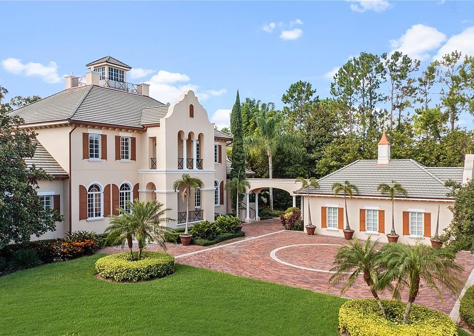 One or more photo(s) has been virtually staged. Formerly featured on the Street of Dreams, this stunning home will make you feel like you’re at a luxury resort in Bermuda. Designed by Mark Nasralla and built by Ray Coudriet, this one-of-a-kind residence is perfectly positioned on over one acre in the 24-hour guard-gated community of Lake Butler Sound. The main house features five oversized bedrooms and five-and-a-half baths, and then there is a detached guesthouse with a guest suite and fitness center. As you step through the front doors, your eyes are immediately greeted by soaring two-story ceilings and bright, airy open spaces. The chef’s kitchen features beautiful custom cabinetry, two islands, each with its own sink, lovely granite countertops, two dishwashers and a huge hidden pantry. The master suite features a separate sitting area overlooking the huge yard and pool, along with a gas fireplace. The spa bath is sure to be a favorite with its massive walk-in closet and an oversized soaking tub with a fireplace for a relaxing evening at home. There is also a great room with a two-story wall of windows, large family room off the kitchen, formal dining room, a sunroom with vaulted ceilings and custom wood beams, a home office and an amazing game room on the second floor. Exterior amenities include a spectacular second-floor balcony overlooking the backyard, with a massive swimming pool, hot tub and a cabana with a bar, sauna and separate pool bath. This amazing residence is located just minutes from fine dining, world-class shopping and all of the area theme parks; the location of this spectacular home simply can’t be beaten.