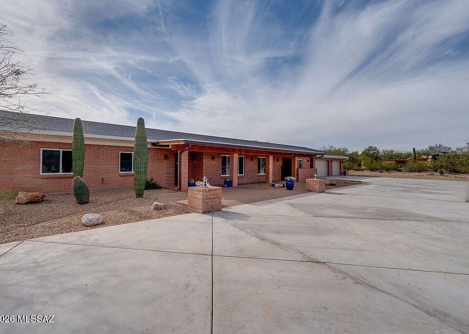 Set within Catalina Ranch Estates, this newly renovated equestrian property spans 3.4+ usable acres with sweeping views of the Rincon and Catalina mountain ranges. The setting offers privacy, open space, and convenient access to Mount Lemmon, Saguaro National Park, and Agua Caliente Wash.The residence has been expanded to a 6 bedroom, 5 bathroom layout, including four suites with private access. Main living areas feature an open modern kitchen, oversized butler's pantry, large laundry room with extensive cabinetry and counter space, updated bathrooms, and fully updated systems, including two Trane HVAC units with new ductwork. A full-length covered rear patio stretches across the back of the home, extending daily living outdoors, with direct access from the primary suite. Thoughtfully updated to preserve the character of the original homestead, a former casita was integrated into the main residence, creating additional connected living space. Complete with equestrian infrastructure, featuring well kept facilities with stalls, feed room, wash rack, and arena. The rear property is fully fenced with an aesthetically pleasing 6ft no climb iron pipe and t-post perimeter.