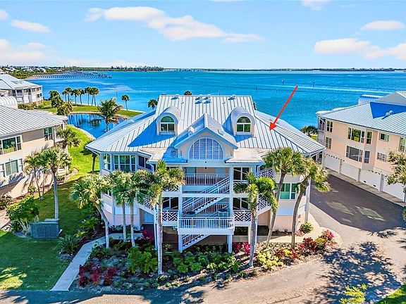 Under contract-accepting backup offers. Welcome to Placida Harbour Club Unit 2804, a premier top-floor residence offering one of the most commanding waterfront vantage points in this exceptional community. With its elevated position and unobstructed sightlines, this residence delivers panoramic views across Placida Harbor, the Intracoastal Waterway, and toward the Boca Grande Causeway—a visual experience that truly sets it apart. Here, location isn’t just important; it’s everything. This expansive 3-bedroom plus den, 3½-bath condominium spans 2,865 square feet and is defined by its dramatic ceiling volume and abundant natural light, a benefit unique to top-floor living. The home’s ideal orientation, combined with expansive impact-resistant glass, fills the living spaces with sunlight while framing ever changing water views of passing boats, playful dolphins and manatees below, and vibrant coastal skies stretching across the horizon. The open living and dining areas are designed for both everyday comfort and effortless entertaining, flowing seamlessly to the screened lanai. Outfitted with roll-down shutters, the lanai becomes an extension of the interior living space, offering year-round enjoyment of the coastal breeze and sweeping water vistas. The kitchen opens to a welcoming breakfast nook, while providing ample cabinetry, generous counter space, and a functional layout for everyday living. The primary suite serves as a private retreat, featuring a spacious bath with dual vanities, soaking tub, and separate shower. Guest suites and the flexible den provide ideal accommodations for visitors or a home office, all thoughtfully arranged to balance privacy and openness. Additional upgrades and amenities include elevator access, a new standing seam metal roof (2023), and a two-car tandem garage with a generously sized private storage room, offering exceptional convenience and storage rarely found in condominium living. Beyond the residence, Placida Harbour Club offers a truly elevated coastal lifestyle. Residents enjoy access to three waterfront clubhouses, three heated pools, a fitness center, tennis and pickleball courts, a deep-water marina with kayak launch, waterside walking paths, and private ferry service to the pristine beaches of Little Gasparilla Island. With extensive community enhancements recently completed the lifestyle here is better than ever. Unit 2804 represents a rare opportunity to own a residence where elevation, light, and location converge—a home that shares the scale and layout of other premier residences yet delivers a markedly superior setting and view experience. This is Placida Harbour Club living at its finest.