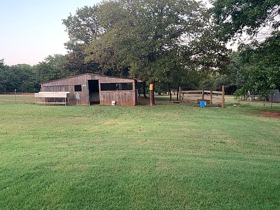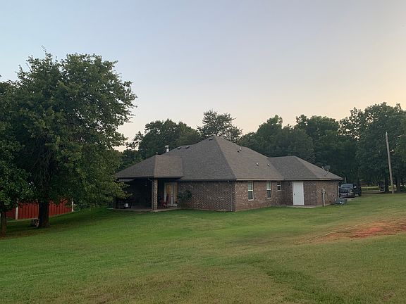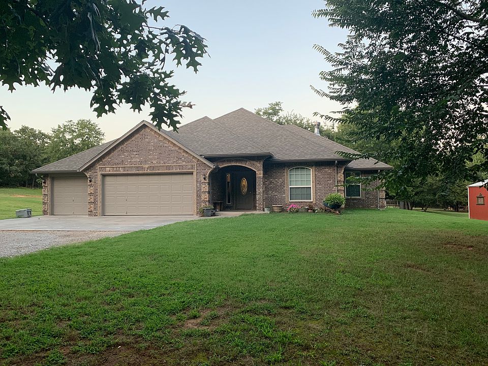 Beautiful home on 5 acres, 4 bedrooms 2 full bath, or 3 bedrooms with study, 3 car garage, fireplace, large Master bedroom with raised ceiling, 20x20 shop with slab floor, storm shelter, barn, small pond, approximately 3 acres fenced ready for livestock, white fence in front with automatic gate opener, large beautiful trees in both front & back yard. Great location with easy access to I-40 and the new Turnpike. Call 405-401-4665 or 405-834-6551 with questions.