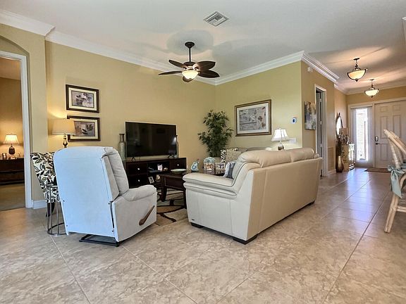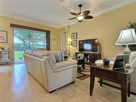 STUNNING! This UPGRADED 2 bed 2 bath + office/flex room boasts CROWN MOLDING throughout, AC 2021, split layout & an oversized yard in highly desirable Valencia Reserve. The foyer opens to a spacious living/dining area w/ tranquil backyard views. The chef's dream kitchen features UPGRADED cabinetry w/ under & above lighting, custom tiled backsplash, pantry, granite counters w/ barstool seating & formal dining. The private master retreat features 2 closets (1 walk-in) & en-suite bath w/ granite dual-sink vanity & frameless shower. At the front of the home, a 2nd bedroom w/ large close & office/flex room at the front of the home enjoy another full bath w/ shower/tub combo. Enjoy entertaining family & friends on your covered/screened patio w/ extended area leading to an oversized yard w/ plenty of room for the grandkids to run around. Valencia Reserve is a resort style active adult community w/ amenities including a luxurious 41,000 sqft clubhouse w/ elegant lobby & reception area, resort style pool, lap pool, resistance pool & hot tub, 9 lighted tennis courts, 4 pickleball courts, social hall, fitness center, Café, card rooms, teaching kitchen, arts & crafts studio, library/computer/pool room & meeting/conference room. W/ over 50 clubs & a Lifestyle Director on site you will always be entertained. Close to fine dining, shopping & the world-renowned Wellington Equestrian Center!