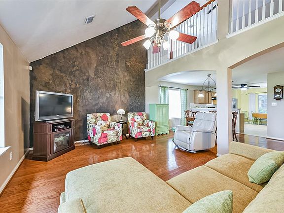 Beautiful 2 story home located in the highly sought after, Riata Ranch. This stunning home offers a spacious 2,000 sq/ft of living space and boasts 3 bedrooms and 2.5 bathrooms. Hardwood floors in living, dining and master bedroom. New carpet upstairs. Fresh paint inside and exterior of home. Features include open floor plan to living, dining and kitchen. Walls of windows with gas fireplace and soaring ceilings in living area. Spacious primary bedroom and half bath on main level. Second level offers a game room, 2 additional bedrooms and a full bathroom. Lush landscaping with gorgeous views of the golf course with no back neighbors! Just around the corner you'll find the Riata Ranch amenities including a huge park, sports courts, playgrounds, & trails! Zone to highly acclaimed Cy-Fair Schools! Riata Ranch is conveniently located minutes from shopping, restaurants, and entertainment offering easy access to major highways. Schedule your private tour, today.