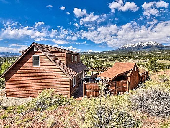 Salida, Colorado home for sale. Quaint and well appointed 2,000 square foot, 3 bedroom, 2 bath home on 13.92 acres. Main floor living with 2 bedrooms, kitchen, living room and 3/4 bath on the main level. Entire upstairs is an expansive, private master suite. 2 car attached garage on the lower level. Secluded patio off the kitchen with built in seating, garden shed, and pergola provides a great space for outdoor cooking and relaxing. Great property for pets, horses, or livestock with no HOA or covenants. Varied terrain including mountainous terrain, level pastures, rock outcroppings, and a seasonal stream to bring life to the property. Elevated location provides unmatched views of the 14,000 foot peaks of the Sawatch Range and the chalk cliffs above Mt. Princeton. Located midway between Salida, CO and Buena Vista, CO and less than 10 miles to Mt. Princeton Hot Springs. A short 2.8 miles on a year round maintained county road takes you to the Hecla Junction Arkansas River Access. Public BLM land is within walking distance of the home and within a short drive are dozens of BLM and National Forest access points. Home has strong vacation rental history and can be sold as a turnkey vacation rental with furnishings, online presence, and existing bookings. Property can also be subdivided.