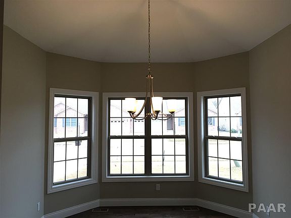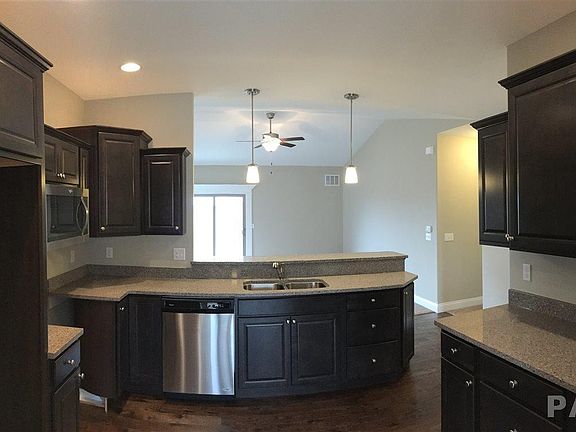 Stand alone, full brick front, 3BR/2BA ranch in Trail Crossing. New 1600 square foot floor plan, formal dining with soaring ceiling, nice size, open kitchen w/ wood flooring and granite tops, fireplace great room with vaulted ceiling, slider from great room lead to covered porch. Beautiful master suite with vaulted ceiling, the master bath offers a double bowl vanity, whirlpool tub and separate shower with tiled walls. Spacious, wide open, full basement with bath rough-in and egress window, 2-car attached garage with extra storage area, main floor laundry and lawn irrigation system included!