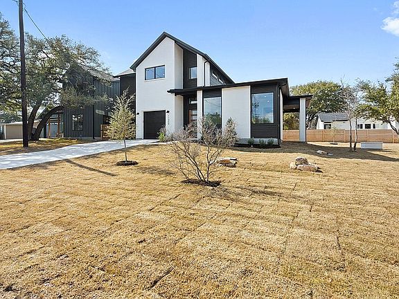 This Modern Home by Bobbitt Builders, Designed by Fazio Architects is on a lot and a half at .24 acres. The large covered patio takes advantage of this expansive outdoor space, perfect for entertaining around the fire pit. Plenty of room for a future pool. This house is completed with wood fencing and landscaping. The open-concept space includes a full appliance package in the Kitchen. A large Island for dining and preparing meals. Beautiful and durable quartz countertops Marble backsplash line the shaker-style cabinets. The main level laundry room includes space for folding and cabinets. Concrete floors on the main level take you to the main level primary bedroom with a spacious en suite bathroom. Thje walk in shower has dual shower heads. Large walk-in closet. has built in mirror and bench. The upper level floor has been designed with wood flooring, a spacious second living area, and two bedrooms that share a bathroom with double sink vanity subway tile and black finishes. This property comes with Tankless Water Heater, Propane Gas which provides for the Tankless water heater, range, and exterior gas hookup for a future gas grill. The property is on septic and will come with a two-year maintenance warranty as well as a one-year Builder warranty. Jonestown Hills is a golf cart community and has easy access to Jones Brothers Park. Includes a playground, Tennis, picnic areas, Walking trails, and access to Lake Travis. Many family festivities throughout the year in Jonestown Park. Short drive to shopping, restaurants, breweries, and wineries.