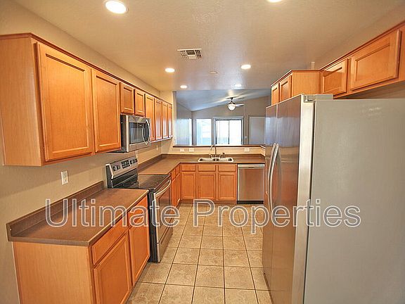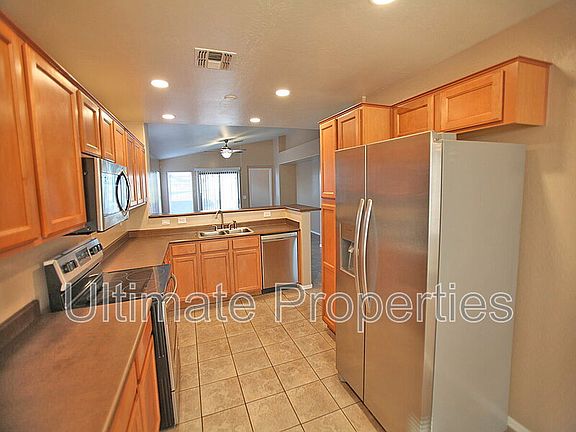Beautiful 4 Bedroom + 2 Bathroom home. Kitchen features new stainless steel appliances including range/oven, dishwasher, microwave, and fridge. Living room features vaulted ceiling and sliding glass door to backyard. Master suite features walk-in closet, separate tub and shower. Washer and dryer are also included! 2 car garage with built-in cabinet space. Backyard features easy to maintain landscaping.