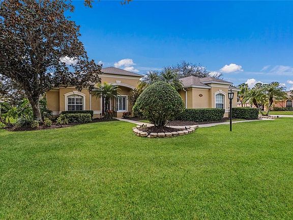 Brand new roof being installed! Positioned on an impressive corner lot within the beautiful, established and centrally located community of Riverwalk, this Lee Wetherington-built home is the epitome of elegance. Blending desirable architectural details with sophisticated finishes and a sweeping floorplan, this residence is ideal for casual family gatherings or more formal entertaining. Double glass doors welcome you inside this four bedroom, three full bath home where you'll take note of the high tray ceilings capped in crown molding, tile and upgraded wood laminate floors throughout (no carpet at all!), custom built-ins and plantation shutters. Pocket sliders in both the living and dining areas allow plenty of natural light and let you enjoy the peaceful pool view from all of the main living spaces. The eat-in kitchen with an aquarium window overlooking the pool and lanai anchors the home, featuring a complete renovation with light-colored wood cabinetry, quartz counters, a coastal chic backsplash, breakfast bar, and stainless appliances. Thoughtfully designed landscaping provides superior privacy from the spacious lanai and solar heated pool. Two covered areas provide the perfect space for lounging by the pool or dining alfresco. The den at the front of the home makes a perfect home office, gym or playroom. A split-floorplan provides privacy for three guest bedrooms from the luxurious master suite showcasing a sitting area with lanai access and an en-suite bath. Located in Riverwalk Village, rest easy with the convenience and seclusion of this quiet neighborhood granting a low HOA fee of only $95/year, proximity to top-rated schools including Willis Elementary, Nolan Middle and Lakewood Ranch High School, as well as all that Lakewood Ranch has to offer. Located only 1.3 miles from Lakewood Ranch Main Street, this location can't be beat!