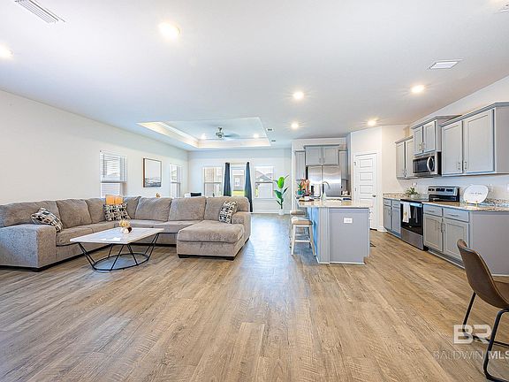 This home is Gold FORTIFIED™ and features Smart Home Technology, which includes control panel, doorbell, smart code lock, smart home light switches, and thermostat, all controlled by one app. is nestled in the quiet back section of the vibrant Jubilee Farms community, offering the perfect balance of tranquility and activity, with one of the walking path entries just around the corner. This Home features, granite countertops throughout, a corner Kitchen pantry, island that overlooks the family and dining room which is accented with beautiful trayed ceilings. The primary suite also has trayed ceilings and a roomy ensuite bathroom, granite tops with shower, and separate soaking tub, water closet, a walk-in closet. Separate Laundry room right across from the homes entrance from Side Entry Garage. This meticulously maintained brick home with Hardy Board Porch accent features a side-entry garage that enhances curb appeal and increases the lot size Inside, you’ll find a thoughtfully designed layout that maximizes comfort and functionality, ideal for everyday living and entertaining. This home is truly move-in ready, and sits on a generous sized lot. Jubilee Farms offers a lifestyle like no other, with its community amenities, such as Resort Style Pool with Slide, adult only pool, Playground, Community Club house that houses the Fitness Center, Game Rooms, Party Room and more. Conveniently located in Baldwin County, it’s close to Mobile, Pensacola, shopping, dining, and Gulf Coast beaches. Nearby access to shopping, dining, entertainment, Theme Park, State Parks and our white sand beaches of the beautiful Gulf Shores and Orange Beach Coast. Whether you're relocating or simply looking for the perfect place to call home, this one delivers on style, location, and incredible value. Schedule your private tour today and see why this home should be Your Next home Buyer to verify all information during due diligence period. Buyer to verify all information during due diligence.