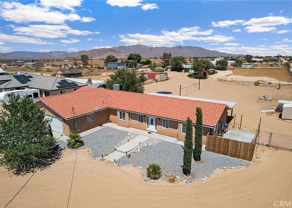 Stunning 3-bed, 3-bath residence nestled on a sprawling 42,000 square foot lot boasting captivating views of the surrounding hills and mountains. Situated in the tranquil unincorporated area of Apple Valley, this home welcomes you with a grand extended driveway, with beautiful rock landscaping, leading to a three-car attached garage with attic space.
