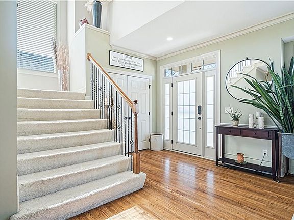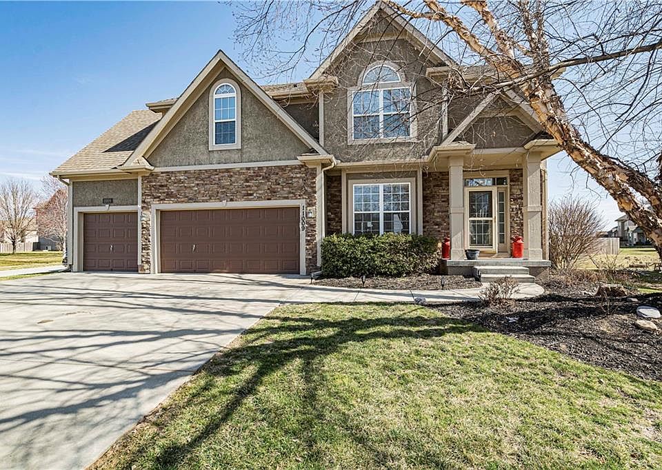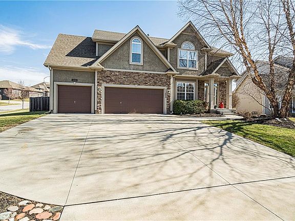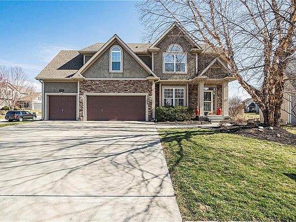 This stunning two-story home in the coveted Staley Hills community offers an inviting open floor plan perfect for both entertaining and family gatherings. As you step inside, you're greeted by a functional main floor featuring vaulted ceilings in the breakfast room and elegant hardwood floors extending from the kitchen to the formal dining room. The kitchen is a chef's delight with its spacious layout, large walk-in pantry, new BOSCH dishwasher, and a central island ideal for meal preparation. Adjacent to the kitchen is a cozy living space adorned with custom built-in cabinets, seamlessly blending style and functionality. Upstairs, the large owner's suite bedroom awaits, a luxurious walk-in shower, and a heated jetted tub for ultimate relaxation. Each additional bedroom is generously sized with plenty of closet space with an attached bathroom. Convenience is key with the laundry located on the bedroom level, simplifying daily chores. This well-maintained home boasts fresh paint throughout, along with a newer A/C unit, ensuring comfort and peace of mind. With abundant storage throughout and a full unfinished basement with an opportunity to increase equity. There's ample room to accommodate your lifestyle and storage needs. Situated on a corner lot, this home offers a fenced backyard, providing privacy and space for outdoor enjoyment. Residents of Staley Hills benefit from its proximity to the prestigious Staley Farms Golf Course, with social or full memberships available for golf enthusiasts. Additionally, the community offers easy access to amenities such as Anne Garney Park and walking trails, as well as a wealth of dining and shopping options. Convenient highway access to I-435 and 169 makes commuting a breeze, while the nearby airport adds to the area's convenience. This impeccably maintained dream home in Staley Hills offers a perfect blend of comfort and style.