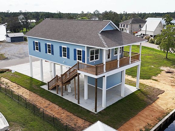 The master suite offers an elegant ensuite bath and spacious walk-in closet. Outside, there is ample space below for parking or a future entertainment area. The covered back deck offers a peaceful canal view with direct access to the Jourdan River, just a short boat ride away. A bulkhead is already in place, ready for your future dock or boathouse. The property also includes a roomy 12x16 storage space beneath the home, and a convenient boat launch is just 1.5 miles away! Experience the perfect blend of coastal charm and modern luxury—your waterfront oasis awaits!