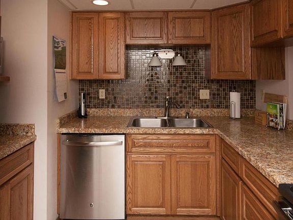 Condo fee is $130.00 per month. Pays for w/s/g lawn care, snow removal, exterior insurance and exterior upkeep. Owner has done a wonderful job remodeling this 2 bedroom corner condo. Newer windows, carpet, appliances, countertops, tile back splash, custom tile shower/tub. Closets have custom organizers. Condo is in mint condition and has a wood burning fireplace.