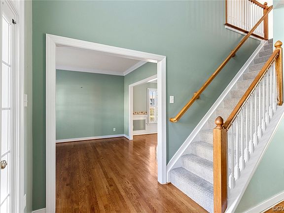 This original-owner home offers 3.5 baths and 4 bedrooms with the potential for a 5th bedroom in the sought after Charter Colony community! Situated on a corner lot adjoining a quiet cul-de-sac, this home is in a PRIME LOCATION only a stones throw from the community’s pool, playground, and sport courts. Stepping inside, you’ll be greeted by the two story foyer and notable features including hardwood floors throughout the 1st floor and plantation shutters throughout the home. Formal living room off of the foyer w/ crown molding is open to the dining room w/ tray ceiling, chair rail and picture molding; perfect for entertaining. The spacious family room offers a gas fireplace (logs have been removed but could easily be replaced) and access to the NEW Trex deck (‘22 $12,000). Light and bright kitchen w/ island, pantry, NEW microwave (‘23), fridge to convey and adjoining breakfast area is open to the family room. NEW CARPET (‘22) on all stairs and throughout the 2nd floor. Primary bedroom features hardwood floors, two walk-in closets and ensuite bath w/ tile floor, dual vanities, walk-in shower and jetted tub. Bedroom 2 w/ carpet, walk-in closet & ensuite bath w/ tile floor & tub/shower combo. Bedrooms 3 & 4 w/ carpet & double door closets share a full hall bath w/ tile floor, double vanity & tub/shower combo. The third floor, w/ electric and ready for drywall (some already available, ready to convey!), could be a spacious 5th bedroom or rec room. The third floor also offers a large unfinished storage area w/ shelving that could also be easily finished off for an additional room! Enjoy relaxing on the rear deck w/ remote control sun setter awning and a view of community amenities or in your backyard that is afforded privacy by a wooded buffer area abutting the property. Thoughtful maintenance items that have been completed include encapsulation of the crawl space and buried downspouts. You can feel this home has been well-maintained and well-loved and now it's just waiting for the next owner to make it their own!