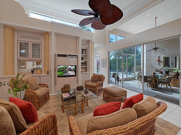 THIS ELEGANT HOME OFFERS LARGE ROOMS, CROWN MOLDINGS, BUILT-IN WOOD LIBRARY WITH FRENCH DOORS, OPEN KITCHEN WITH WOOD CABINETRY, AND SS APPLIANCES. THE MASTER SUITE FEATURES A LOVELY SITTING AREA AND SPACIOUS HIS/HER CLOSETS. THE MASTER BATH HAS A WHIRLPOOL TUB, DOUBLE SINKS, BIDET AND MARBLE TOPPED VANITIES. ONE GUEST BEDROOM SUITE PLUS A SECOND GUEST BEDROOM SUITE OVERLOOKING THE POOL THAT COULD BE AN IDEAL SECOND MASTER. PERFECT OUTDOOR FLORIDA LIVING WITH A SCREENED ROOF PATIO, ACCESS TO CABANA BATH, LARGE PATIO OVERLOOKING THE POOL WITH WATERFALL SPA, EXTENSIVE LANDSCAPING PROVIDING PRIVACY & GOLF VIEWS. OTHER FEATURES INCLUDE 3 CAR GARAGE, NEWER A/C AND ROOF. DO NOT MISS THIS EXCEPTIONAL PROPERTY CLOSE TO ALL CLUB AMENITIES. GOLF MEMBERSHIP PURCHASE REQUIRED ($130,000) AT CLOSING.