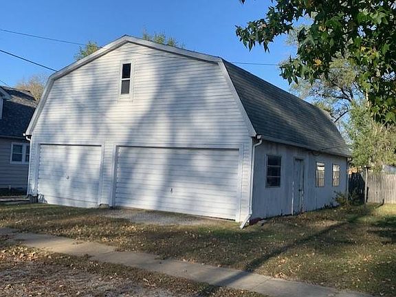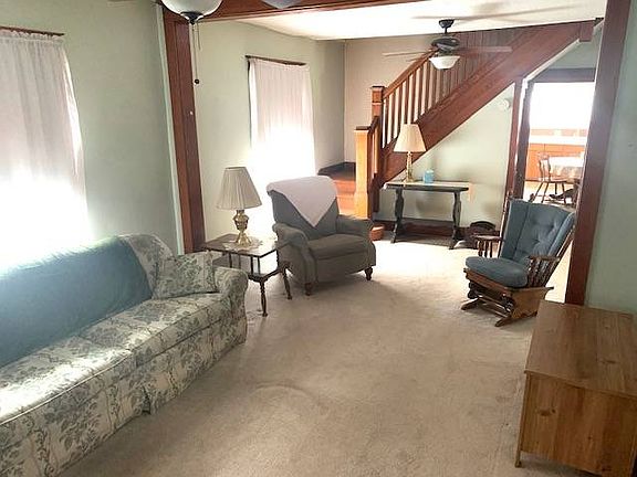 Entrance: Back porch opens to a huge eat-in kitchen. Kitchen: Lots of birch cabinets, white counter top, painted walls, vinyl floor. Built in china closet. Room for big family dinners inside this kitchen. Laundry room off kitchen includes washer and dryer. Living Room: This large open room has painted walls, cream plush carpet, lots of light from windows and natural woodwork. One end has an open staircase to second level. Bedroom: Hardwood floors, paneled walls, pocket door to living room. Bedroom: Hardwood floors, paneled walls, large closet for extra storage. Bath: White fixtures, tan vinyl flooring, white vanity. Upstairs: 3 spacious bedrooms, carpet floor, wallpaper, storage. Basement: Big open dry basement holds the High efficiency gas forced air furnace that is only 2 years old, 100 amp breaker box, PEX plumbing, and new water heater. Garage: 4 car garage with full second floor for a gathering place for family events.