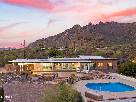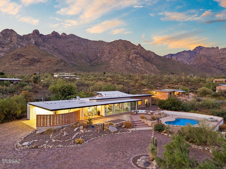 Welcome to luxury living in the picturesque Catalina Foothills! This stunning mid-century modern property offers a rare opportunity to own 4 acres overlooking the surrounding mountains & cityscape. The main house features 4 BR, 3 BA + Studio, pool, & separate guest house with a private driveway just steps away. Meticulously maintained with numerous upgrades, including the gated paver driveway, custom kitchen & cabinetry, renovated bathrooms, upgraded windows & doors, backyard lighting & irrigation, new appliances & more! The property offers privacy & serene desert landscaping, while being within minutes of the Iris Dewhirst Pima Canyon Trail System, restaurants, & shopping. Enjoy nods to the original character of the home as well, originally designed by Tucson Architect, Bernard Friedman.