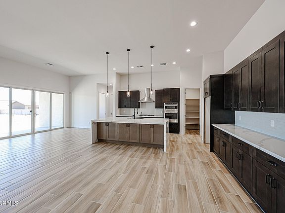 Completed Full Spec Luxury home. 4 bedrooms, plus an office/den, and 3.5 baths. This home features a 2 car and 47 ft. RV Garage on one acre lot without HOA. Open design includes a Great room with 12-foot ceiling and an island kitchen featuring quartz countertop with waterfall edge, GE Profile appliances, Napa fawn cabinets at the island, Napa onyx cabinets elsewhere. Each bedroom has its own walk-in closet, while the owner's suite features a lg. walk-in shower, standalone tub, and dual vanities. 8-foot doors throughout. Constructed for durability and energy efficiency, it includes 2x6 exterior framing, spray foam insulation, and a post-tension slab foundation. Complete block fence included with Gates - 4 ft and 12 ft RV. Photos are of this home. Alarm is active and included.