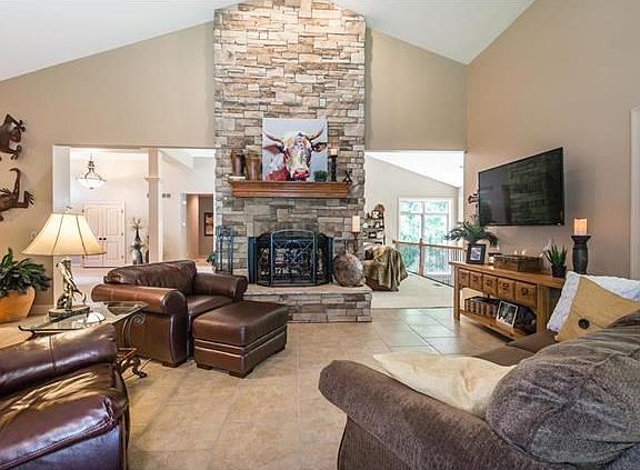4626 sq feet total living in this atrium ranch nestled on 3+ wooded acres. This custom built atrium ranch has superior craftsmanship & architectural detail. The gourmet kitchen features a 9.5 ft. center island, custom staggered cabinetry, a see-thru floor to ceiling stacked stone wood-burning fireplace, beverage center & walk-in pantry. The master suite offers a bay window w/ plantation shutters & luxurious bath with glass walk in shower, custom tile surround and massive soaking tub. Soaring vaults in great room w/wrought iron spindled staircase & atrium overlooking trees! Retreat to 1600+/- sq. ft. of finish in lower level w/ 2 large additional bedrooms/suites, full bath, billiards room, & a rec./family room w/ custom wet bar for entertaining. Relax & enjoy nature from 2 decks; one partially covered with a wood burning floor to ceiling stone fireplace overlooking the property. 4 car oversized side entry garage, Cul-de-sac Lot, Home Sound System, minutes from the Wineries & Hwy 64/40.