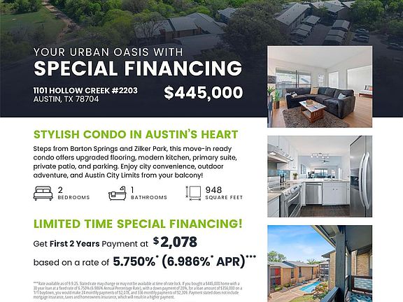 *Free 1 point rate buy down for 1 year with preferred lender* Steps from the crown jewel of Austin, Barton Springs Pool and Zilker Park. This move-in ready condo offers unbeatable access to Austin’s best outdoor and urban amenities. This home is perfect for outdoor lovers, while downtown is just a quick bike ride away. Inside, enjoy upgraded luxury vinyl plank flooring in the main living area and hard tile in the kitchen and wet areas. Fresh paint throughout the upgraded condo and high-end carrier high efficiency HVAC. A set of modern french doors leads to a spacious bedroom or office. The well-appointed kitchen features updated stainless-steel appliances, ample counter space, and a breakfast bar—perfect for both everyday convenience and entertaining. The large primary bedroom includes a walk-in closet, and the condo comes with two reserved off-street parking spaces. Step outside to your private patio overlooking the community pool, a great spot for relaxation and entertainment. Austin City Limits fan? Hear the headliners from your balcony without leaving home! For more info, go to: https://wkf.ms/4iHCOTw