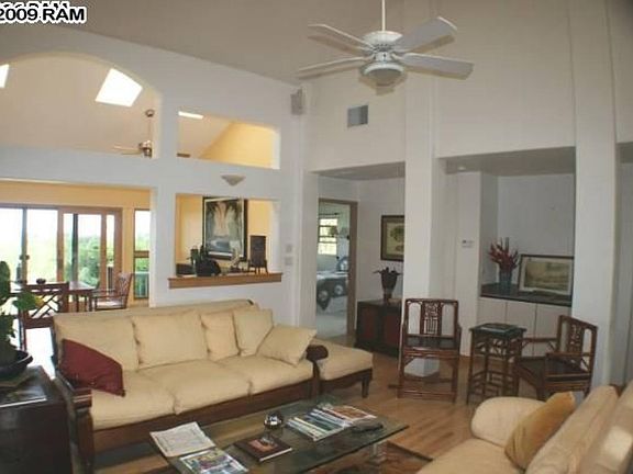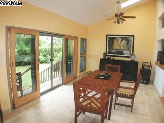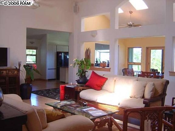 Check out this contemporary plantation home designed by an award winning Maui architect. Enter through the glass doors in to the great room with a vaulted ceiling and maple flooring..There is a chef's kitchen with granite counters, an island and custom cabinetry. Just off the kitchen is a dining room with tumbled marble flooring overlooking the serene back yard. There is also a separate studio/exercise room/ office, all fully permitted and an indoor finished laundry room.. This comfortable hom e has central air and skylights. The two acres is virtually all useable and tropically planted with palms, bamboo, flowering shrubs and citrus.