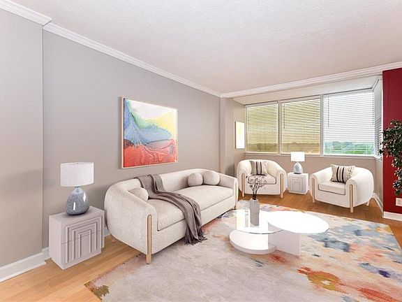 An inviting open floor plan in unit 907 connects the kitchen, dining room and living room. Hardwood floors and plantation blinds throughout. Freshly painted. The kitchen features designer cabinets, some with glass fronts; stainless steel appliances and dual-height solid surface countertops. Perfect for entertaining. A spacious closet at entry provides shelving for storage. A linen closet or pantry is located in the hallway. The full bath has an updated vanity, fixtures and a shower/tub combination. An en-suite with shower and updated vanity is adjacent to the large primary bedroom. Bedroom two features a double closet and four floor-to-ceiling windows that provide plenty of natural light. Bedroom three contains a double closet and could be a bedroom or an office. HOA fees cover utilities except for phone. Amenities include library, fitness center, lounge and event center, pool with outdoor kitchen, and courtyard. Located close to medical and downtown entertainment and businesses.