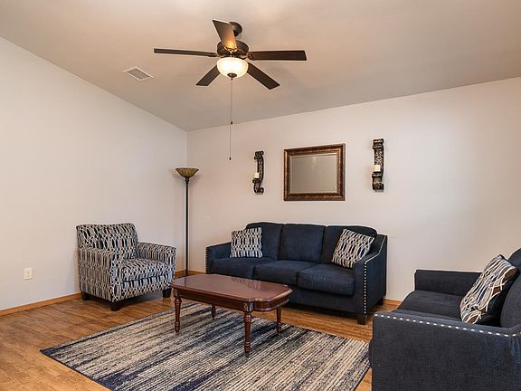 EVERYTHING you want in a house is right here for the asking! This corner lot , cozy home has a Zero entry that feature 3 bedrooms and one full bath with extra wide door frames and hallway. Dining area off the kitchen so you can visit with the chef. A kitchen that sports an eating bar and plenty of cabinets. All the bedrooms are nice sized with ceiling fans for comfort. And have I mentioned, the bathroom is also a safe room for those nasty storms that seem to whirl and creep on us in tornado alley. A separate large laundry room as you enter from the Oversized garage and right off kitchen hallway is convenience in a package. Let's step outside to the fenced yard, patio, sod grass (yes it has both, a well and sprinkler system!) Now, Enjoy the fruit from the peach and pear tree in your own backyard and the comfort and security of the alarm system already in place. Built in 2017, just Can't wait to make it your home!