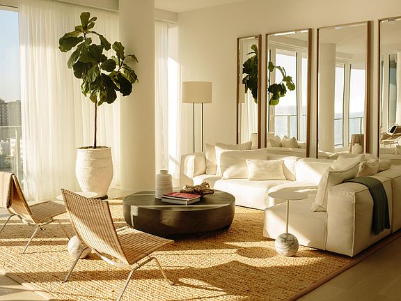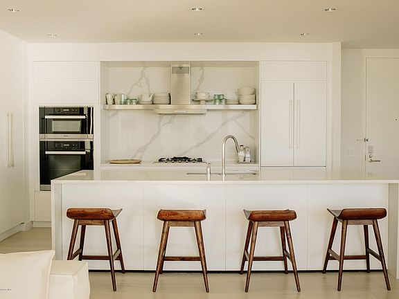 The Ultimate Beach House | Residence 606 at Asbury Ocean Club is effortless living at its best. This split two bedroom, two bath home celebrates the oceanfront with hurricane proof floor-to-ceiling windows and sliding glass doors for direct access to the private 320 square foot terrace with an outdoor room to take in the sweeping views of the ocean and the coastline. The interior design gleams with chic materials including 7' wide-plank, bleached white oak hardwood flooring, white lacquered custom cabinetry by Spazzi of Spain, stone countertops and center island, a Miele kitchen appliance suite equipped with a gas cook top and hood, oven and speed oven, dishwasher, refrigerator and freezer, a Nantucket stainless steel sink with InSinkErator garbage disposal and Hansgrohe faucet.