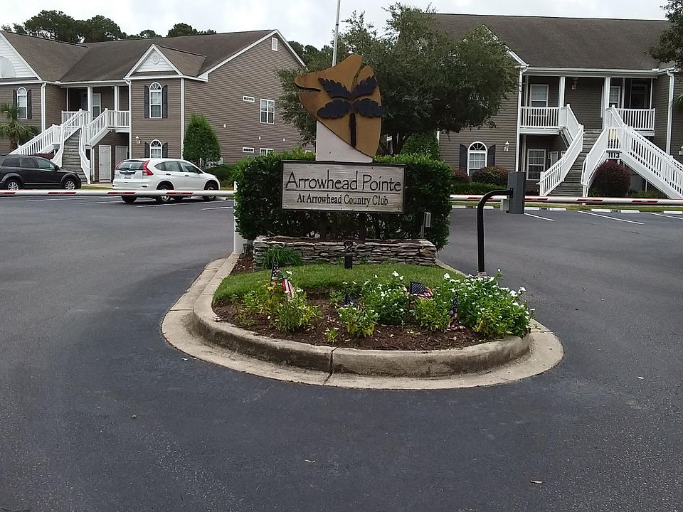 Freshly painted throughout!! Arrowhead Pointe is a gated community of condos in one of the best locations in Myrtle Beach. Freshly painted and move-in ready. Washer and dryer is included. It's an end unit that's very quiet and has both lake and golf course views from the master and screened porch. Split bedroom floorplan and a spacious galley kitchen with the dining area conveniently nearby. Ample closet space and a separate outside storage area. Considering the location, size, and fantastic condition, this is the best value available in the area! Water, trash pick-up, basic cable all included. 1st months payment and security deposit required up front. $0 application fee.