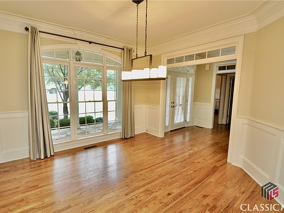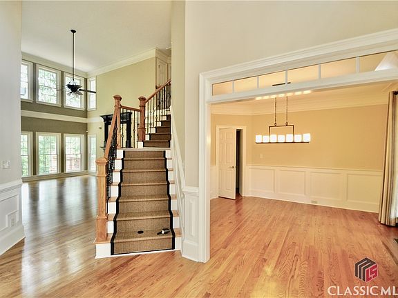 This impressive 5 bedroom, 5 bathroom home is located in North Oconee's quaint Planter's Ridge neighborhood. Features of the home are gleaming hardwood floors throughout the main level, ample storage space, modern light fixtures, and fabulous crown molding. Just inside is an open concept foyer leading straight into the bright and airy, two-story great room complete with nearly ceiling-to-floor windows on the back wall, an elegant fireplace, built-in cabinets, and plenty of room for all kinds of furniture to suit your style. In the front of the house is the sophisticated dining room with wainscoting, drop-in lighting, and an extended feel for you to share meals on any occasion. The sprawling, eat-kitchen boasts granite countertops, a tile backsplash, stainless steel appliances, large island, hanging pots and pans rack, and tons of natural light. Designed with luxury in mind, the tremendous owner's suite is situated on the main level and offers a trey ceiling, carpet flooring, a ceiling fan, and an ensuite updated bathroom featuring a dual sink vanity, soaking tub, and stand-up, glass shower. Completing the main level is a spectacular office space designed with coffered ceilings and a closet that could easily be used as a bedroom as there is a full bathroom next to it. Upstairs are three more sizable bedrooms, including one with a private ensuite bathroom, with ceiling fans and an abundance of closet space, and two full bathrooms. The finished basement holds a media room with a bar, a billiards room, cozy bedroom, flex room that could be for crafting and a separate gym, as well as a full bathroom. For the handy individual, there is a workshop/storage space to work on projects and store your tools. In the back and off the main level stands a considerable grilling deck that leads down to the covered stone patio off of the basement. The substantial 1.28 acre wooded lot is manicured, private, and backs up to a creek. This perfect package is located just 14 minutes from Butler's Crossing shopping and dining, 17 minutes to Downtown Watkinsville, and 20 minutes to Downtown Athens.