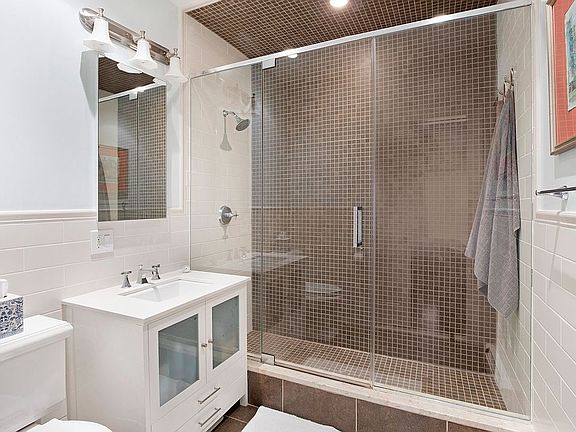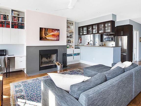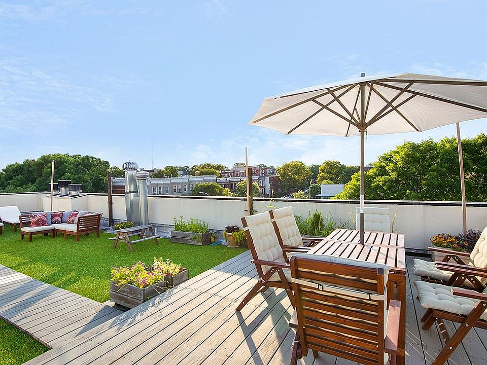 The penthouse at 1103 Prospect Ave is a incredible space with a enormous planted private roof located in the idyllic neighborhood of Windsor Terrace and just three short blocks from Prospect Park. Light streams into the apartment through three exposures (N/S/W) overlooking tree lined streets. The open plan living room features a wood burning fireplace, recessed lighting, dining alcove and french doors to a private balcony. A windowed kitchen includes new, stainless appliances, caesarstone countertops and breakfast bar. Beyond the kitchen, you will find a well-appointed, windowed bath with soaking tub, in-unit washer/vented dryer and two spacious bedrooms. Off the quiet master bed, you’ll find an en-suite tiled bath and private balcony. Perhaps the most unique feature of this apartment is the thoughtfully designed 1100sf+ private roof deck accessed through the living room. Arranged with multiple uses in mind, one could imagine the raised deck area as the perfect spot for cocktails and dinner parties while the turfed lower level might accommodate a safe play area or sunbathing. Custom planter boxes line the entire area and both electricity and water have been installed. Finally, storage is abundant throughout the unit and an extra large on-site storage unit is included. Parc Maison is a solidly constructed and well run boutique condo which enjoys incredibly low common charges and a tax abatement through 2024. Fantastic eating and shopping options abound within a few short blocks and conveniently, you’ll find a pharmacy and market across the street. The F/G train stop is an 8 minute walk away and the property is zoned for District 15 which includes P.S. 154 The Windsor Terrace School and Pre-K Center at Bishop Ford School Site. $160 assessment in place until Oct 2019.