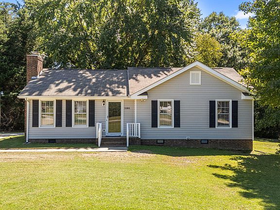 The home is a single-story ranch style house with simple clean lines. The exterior is neutral vinyl siding with shutters framing the front windows. Inside the floor plan is comfortable with a working fireplace. The kitchen is modest but functional, featuring standard cabinetry, laminate countertops and a small dining nook overlooking the backyard. Three bedrooms are compact yet comfortable. A bathroom with a tub/shower combo and adjoining half bath serves the household. The lot provides plenty of space outdoors. A large backyard stretches behind the house off a spacious deck. Front yard is simple with grass and a few shade trees. The concrete driveway offers adequate parking. Overall the house is unpretentious, practical and inviting, a manageable size for a small family with the bonus of generous outdoor space.