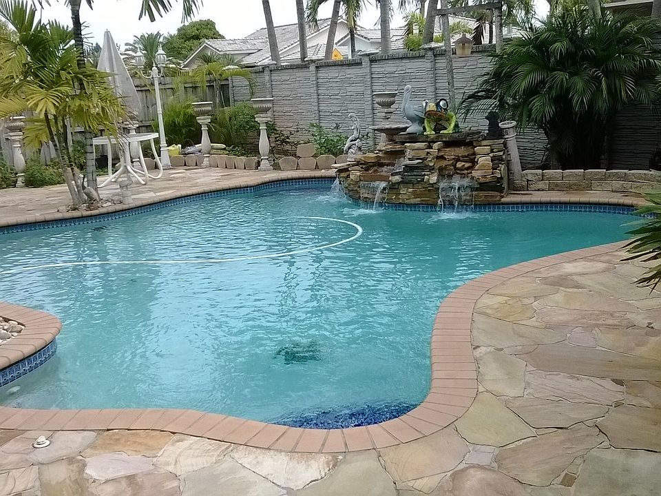 Corner property, free form swimming pool, ceiling covered patio and screen, custom brick barbecue, access to the property by each side of the house