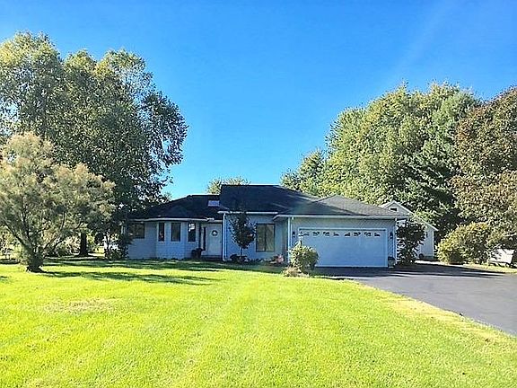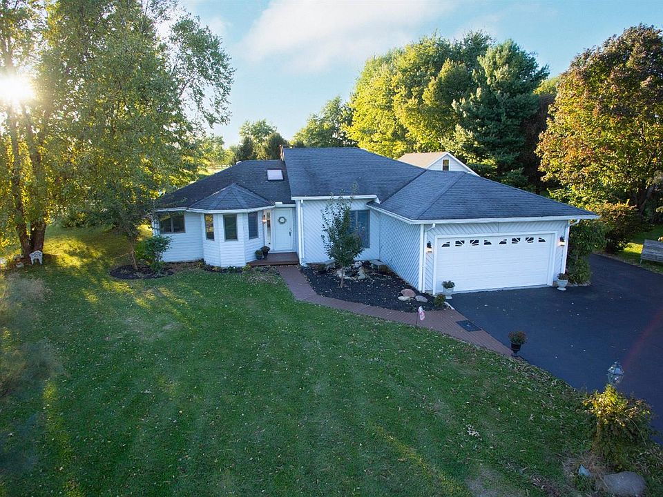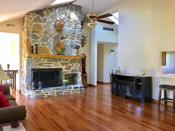 Pristine single level living on a quiet 1.3 acres. Great room boast massive stone fireplace and vaulted ceiling; 4 skylights throughout; New Hickory hardwood floors throughout. All recently painted inside including garage w/epoxy floor- Must see!