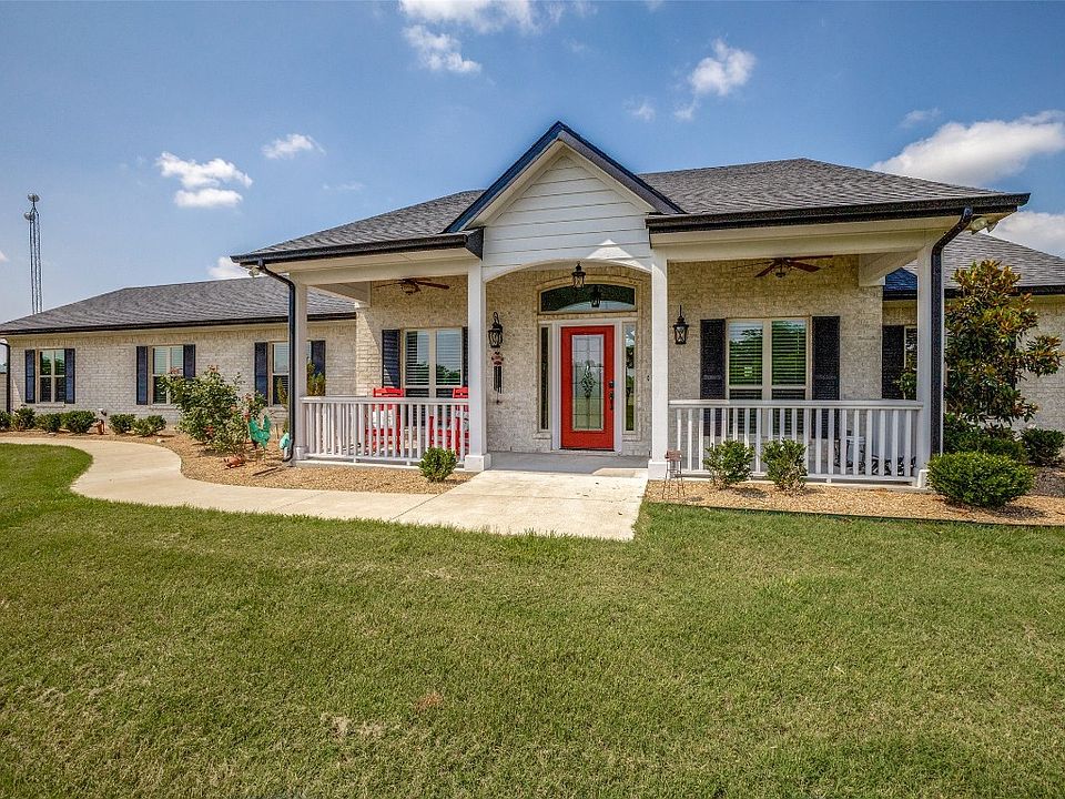 Showings begin Friday 5-26 Beautiful custom home with 14+ acres. Large front porch! Family home, or a great weekend ranch to escape the big city. Open floor plan! Huge 12' island, storage galore! Vaulted ceilings & custom cabinets! Gas stove with 8 burners! 3 ovens! Pot filler and custom vent. Coffee bar. Huge pantry with storage, bar, & desk! You have to see this pantry! The utility room is a cleaning and organizer's dream with coat & backpack storage, a dog washing and feeding station, a farmhouse sink, & cabinets. The media room (or garage), is wired for sound! The primary bedroom has french doors to the backyard. The primary bath has an extra large shower, and 2 massive closets to hold the largest of wardrobes. 2 bedrooms with walk-in closets and built-in shoe rack. The outdoor kitchen has a fireplace & mantel making it a beautiful place to unwind or entertain! The patio is wired for sound & tv. Workshop with ac & heat! Too many extras to mention! Homeowner thought of everything!